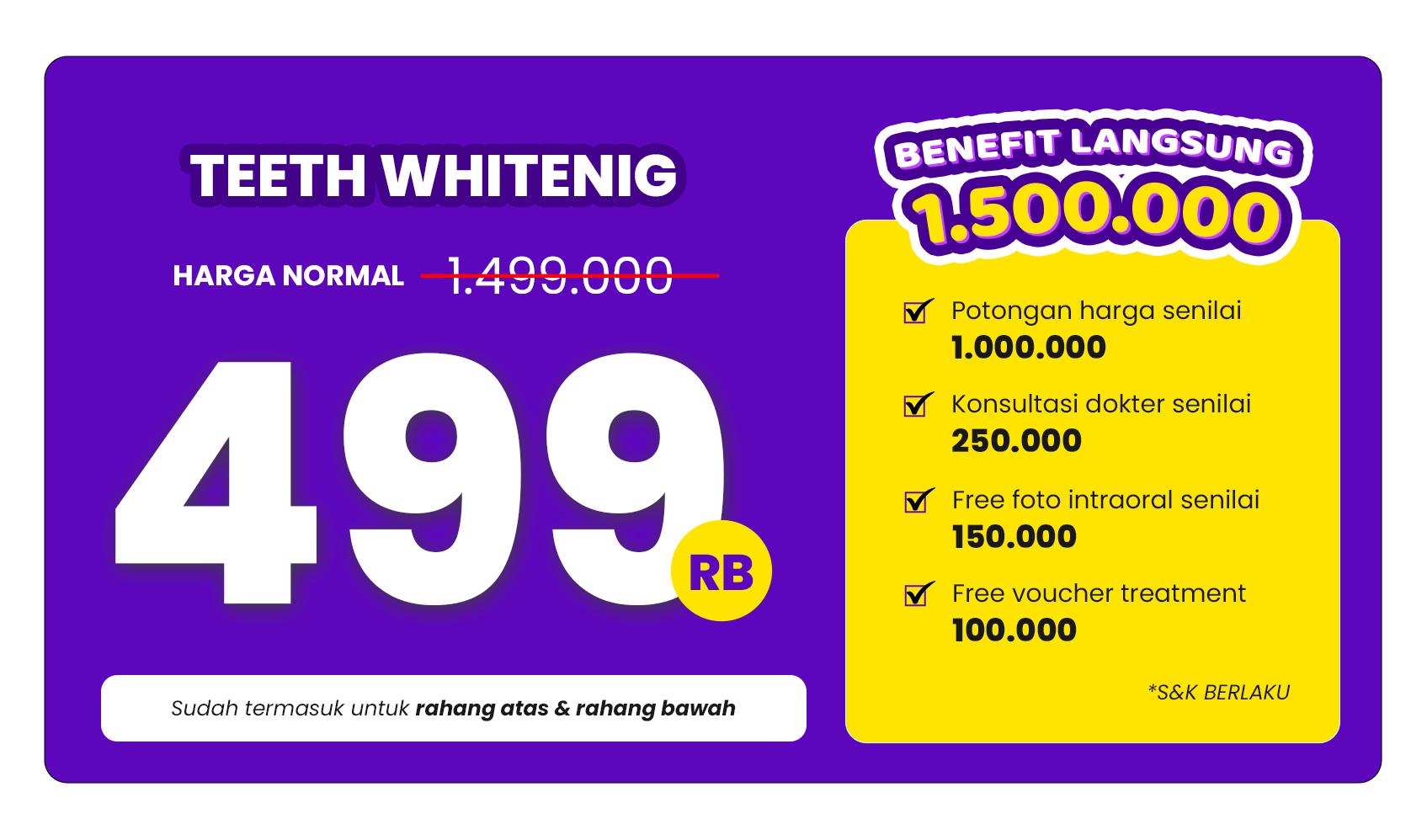 Warna gigi sering kali menguning akibat kopi, teh, rokok, atau faktor usia. Perawatan teeth whitening membantu memutihkan gigi yang kuning menjadi lebih putih dan membuat senyum terlihat lebih segar, serta memperbaiki tampilan estetika tanpa mengubah bentuk gigi.